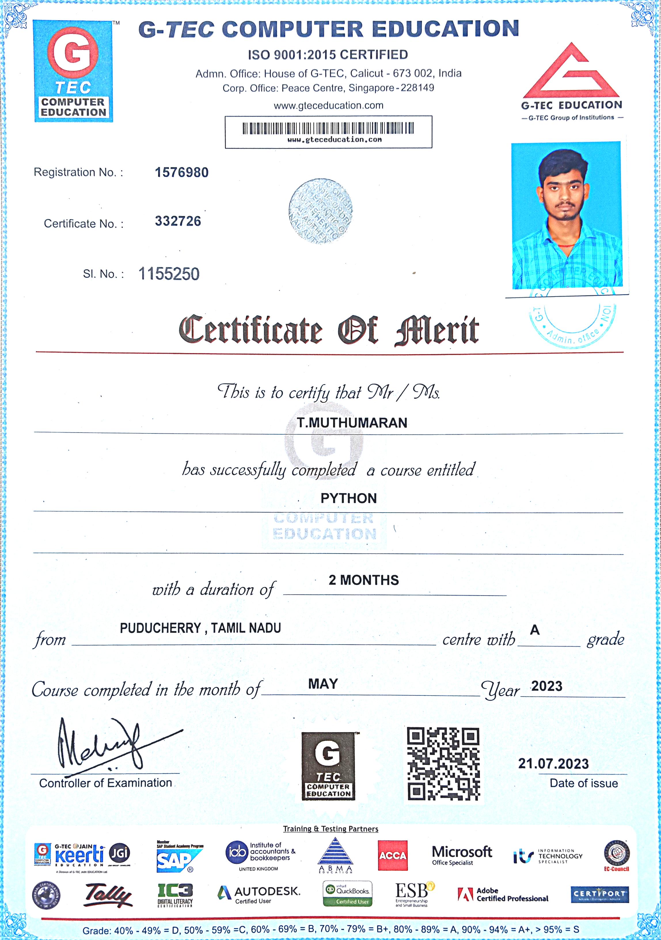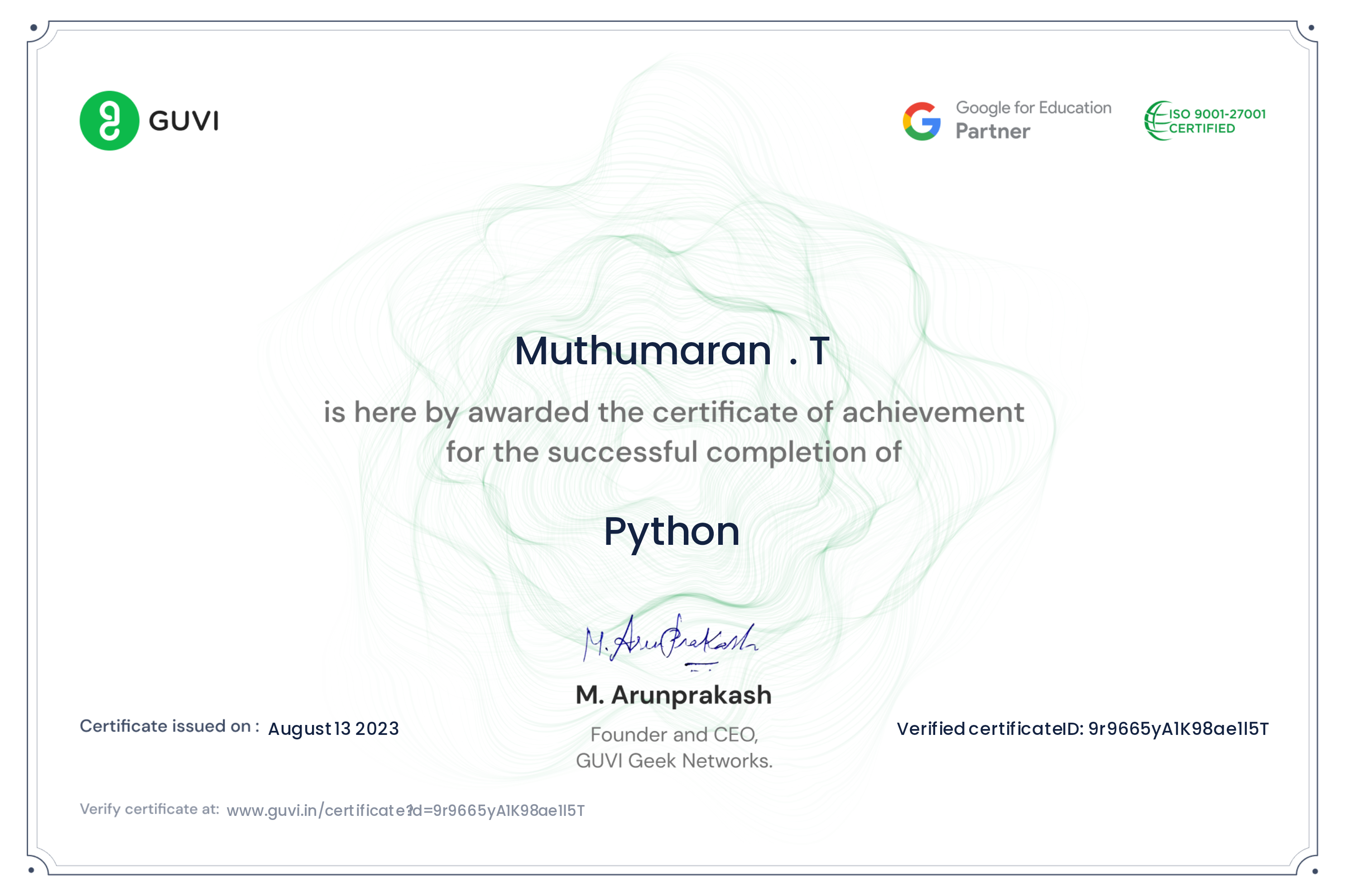 "Hi, I'm Muthu Maran, a Computer Science enthusiast deeply passionate about data science and full-stack development. With skills in Python, Java, and JavaScript, honed through hands-on projects and certifications like ISO Python Development and IBM Cloud Computing, I aim to tackle real-world challenges. As a finalist in the Inventors Challenge 2023, I'm committed to using technology for positive change."